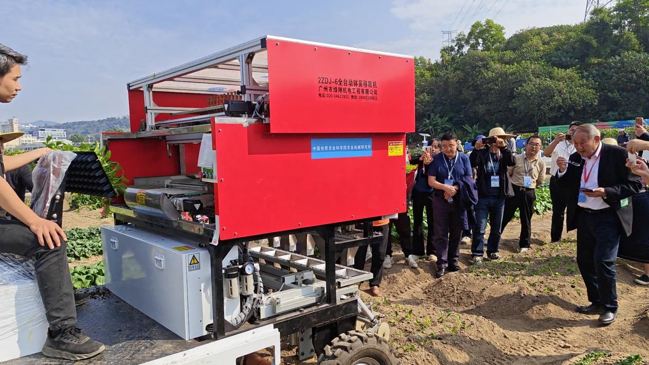 在地展环节,由广州市绿翔机电安装工程有限公司和华南农业大学工程学院、中国热带农业科学院农业机械研究所联合研制的全自动蔬菜移栽机备受关注。该机采用自走式无级变速底盘,一键实现穴盘输送-起苗-投苗-栽植-覆土-压实,种植效率可达10800株/小时。在演示环节更是受到罗锡文院士亲临指导。