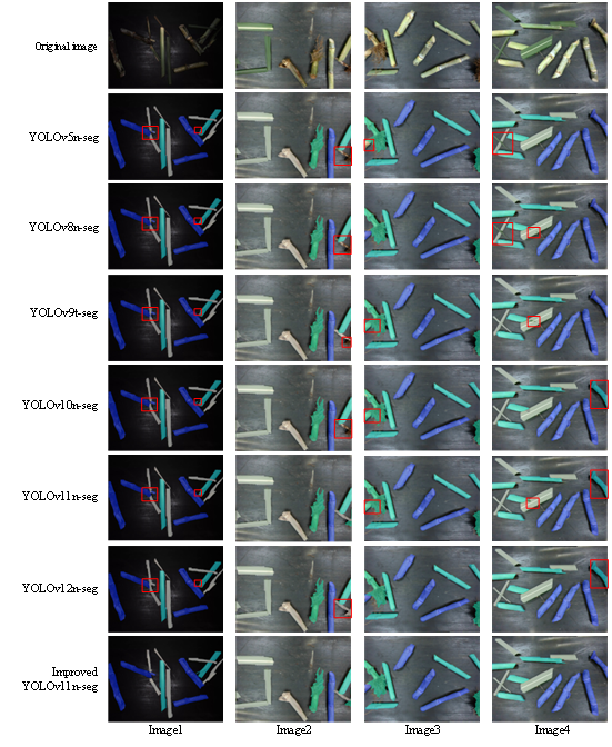 近日,农业机械研究所联合广西壮族自治区计量检测研究院、国家蔗糖产业计量测试中心(筹)在甘蔗杂质分割检测方面取得重要进展。机械收获甘蔗中杂质的含量,对评估收获质量和售卖价格至关重要。而在智能化甘蔗含杂率检测中,准确的杂质分割是含杂率计算的基础。为此,本研究提出了一种基于改进YOLOv11n-seg的甘蔗杂质检测方法,并将其搭载于团队前期研发的三级渐进式几何约束与差速牵引协同的分级装置中。